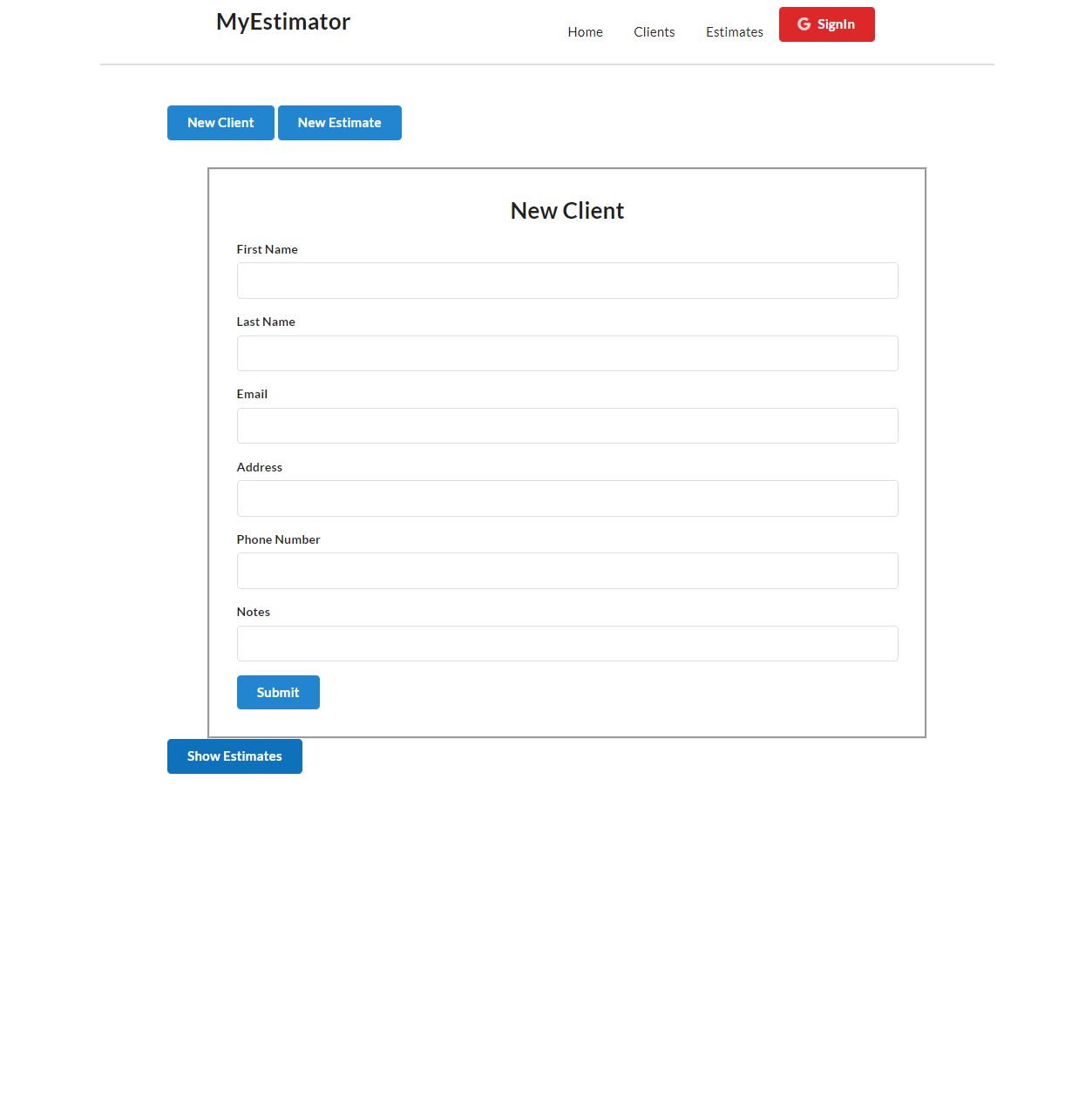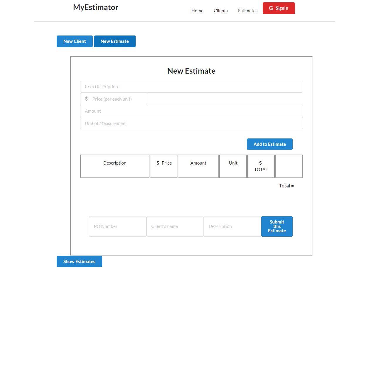 React.js Redux front end estimating spread sheet application
